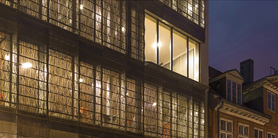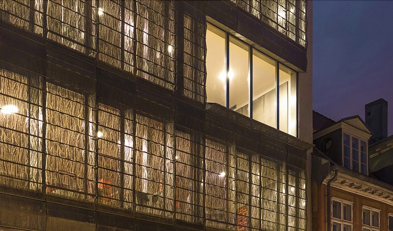 3. Ved mørkets frembrud tændes en dæmpet belysning bag messingskærmen, der præsenterer bygningen som et modernistisk glashus svøbt i et transparent filigrangardin.