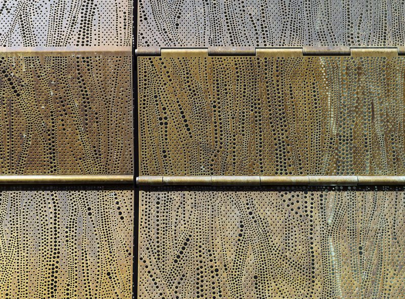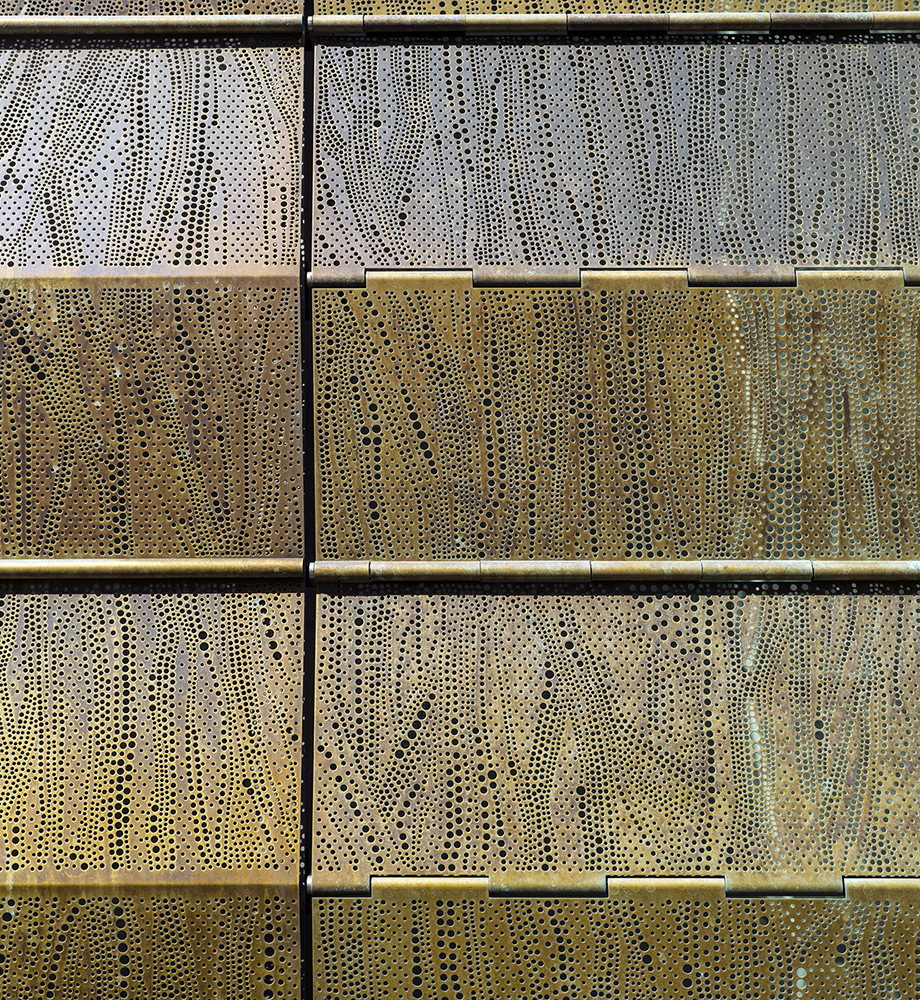 Imellem de to gavle er glastag og facade. Uden på glasset ligger en skærm af gul messing, der som et stykke tekstil, følger glassets form på tag og facader.