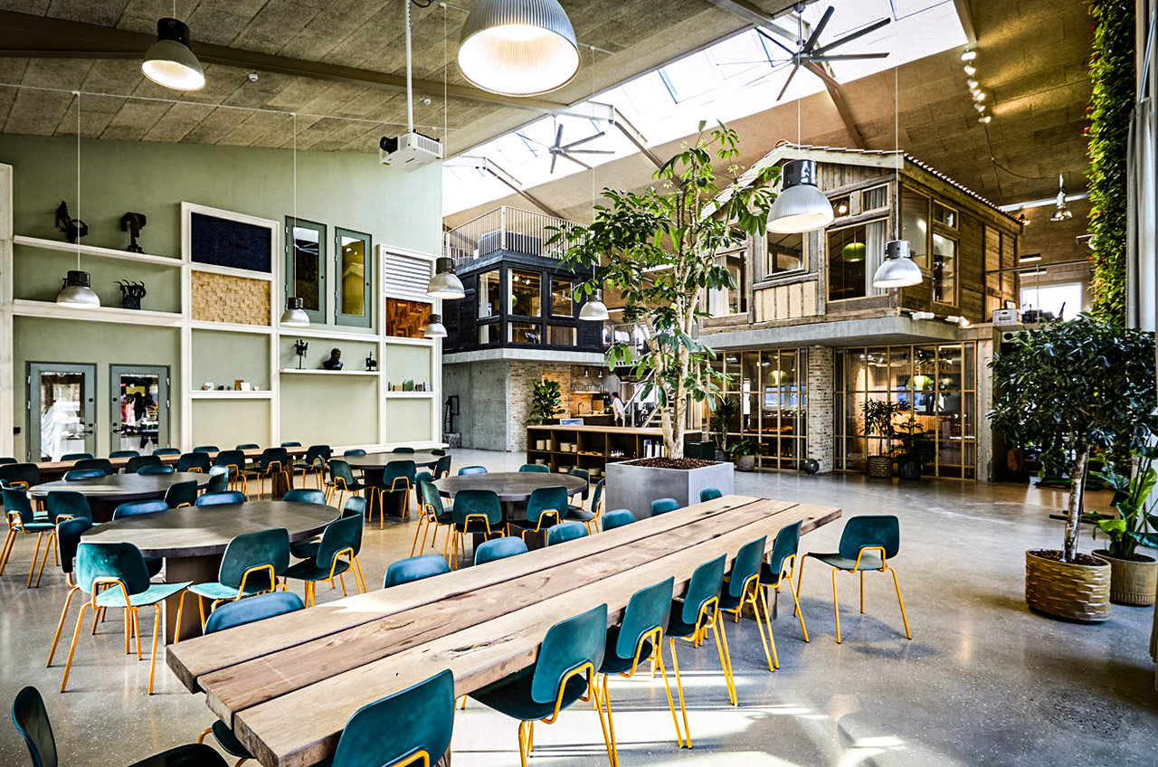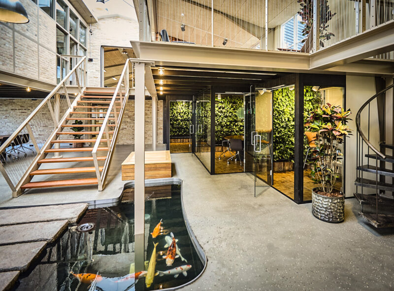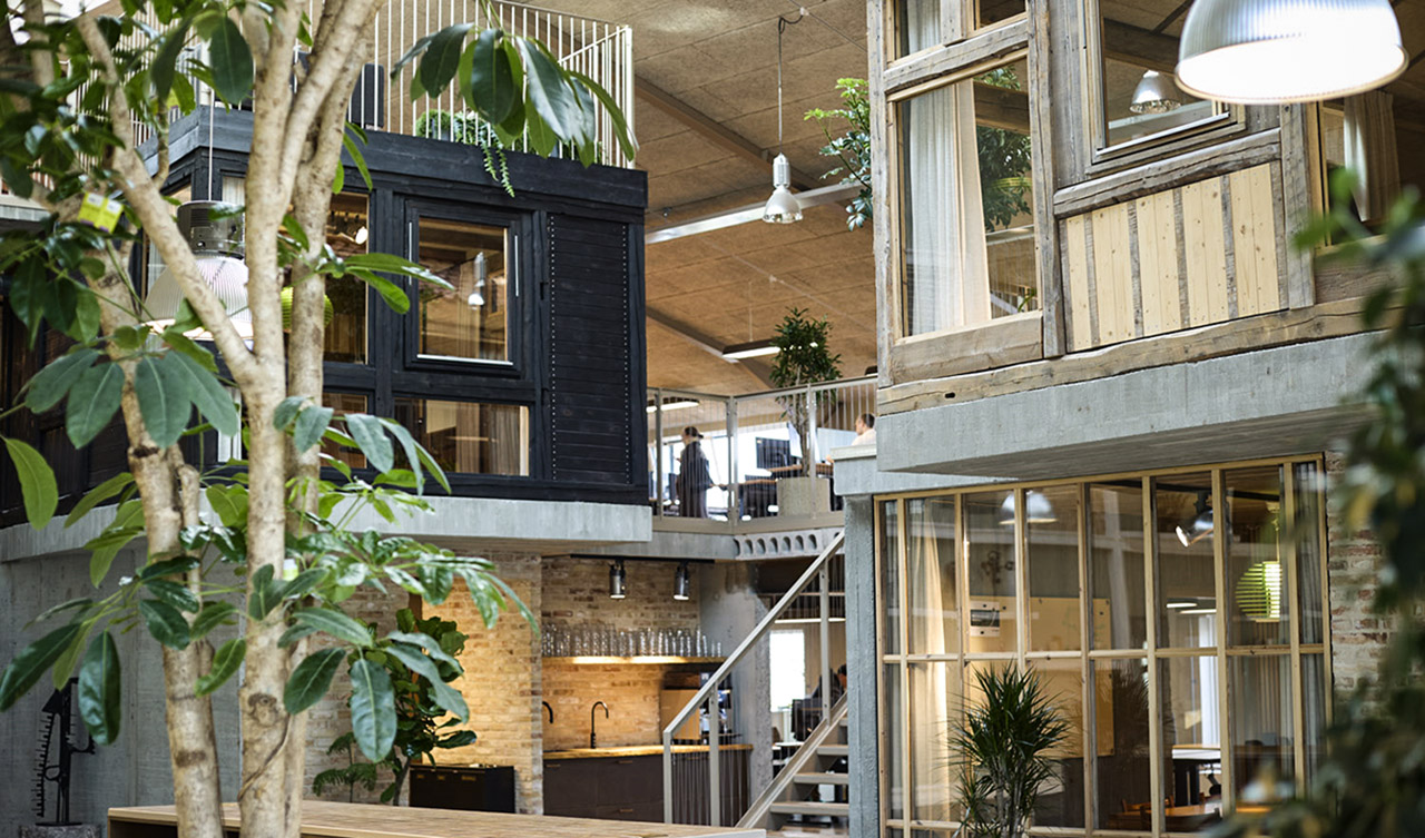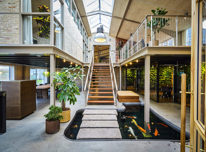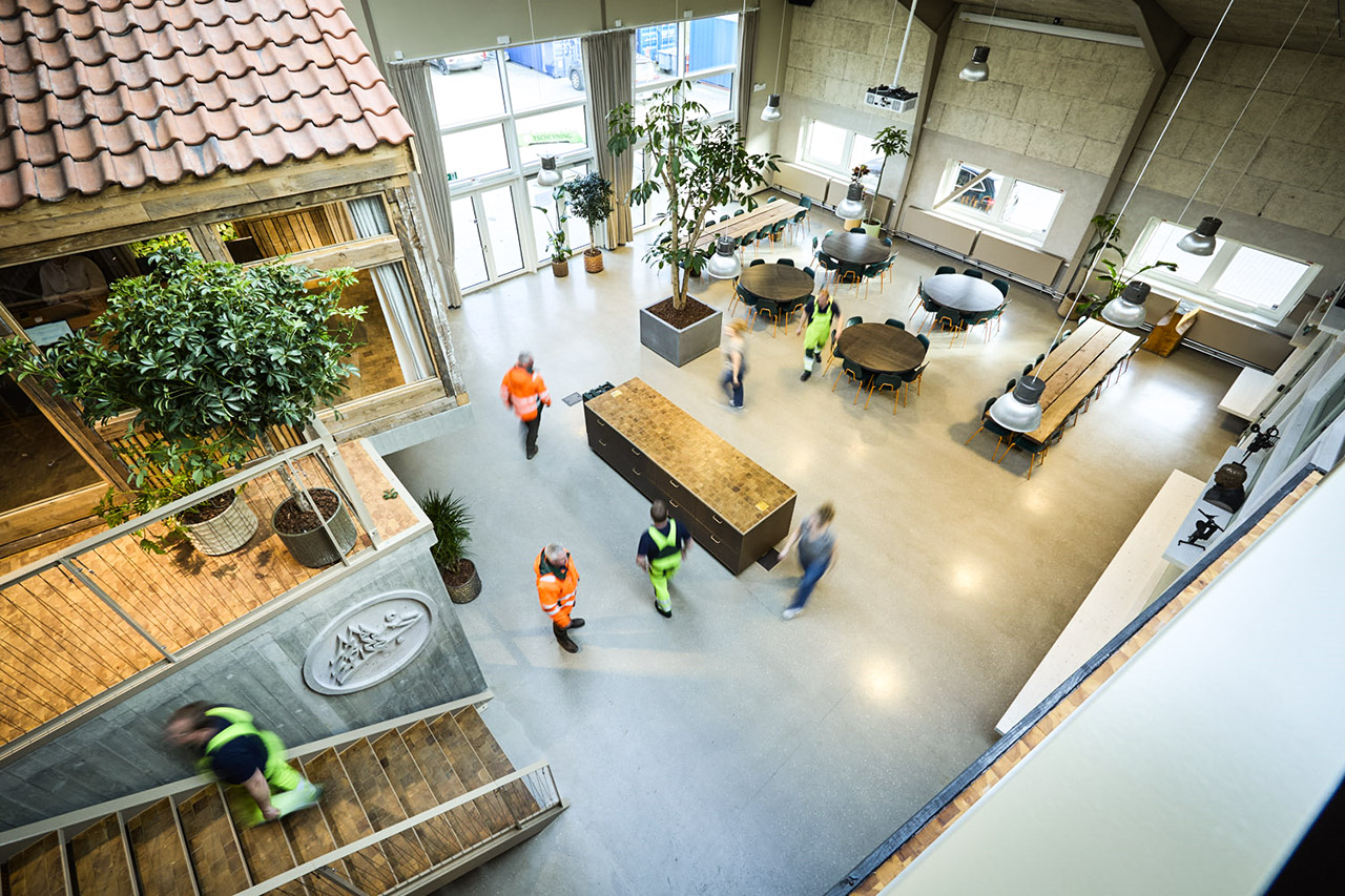 - Kontakten til naturen, både indenfor og udenfor, smelter sammen med store vinduespartier. Huset har masser af dagslys, indendørs planter, vandelementer, og brugen af typiske "udendørsmaterialer" indenfor som tagsten og mursten får en til at føle sig både ude og inde på samme tid – med det formål at understøtte det gode arbejdsmiljø og minimere kontortrætheden.