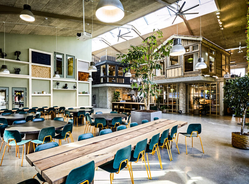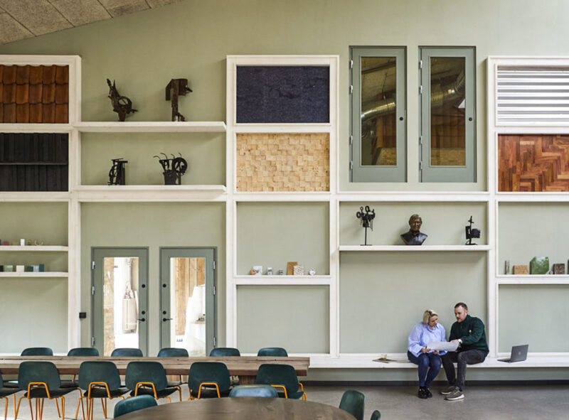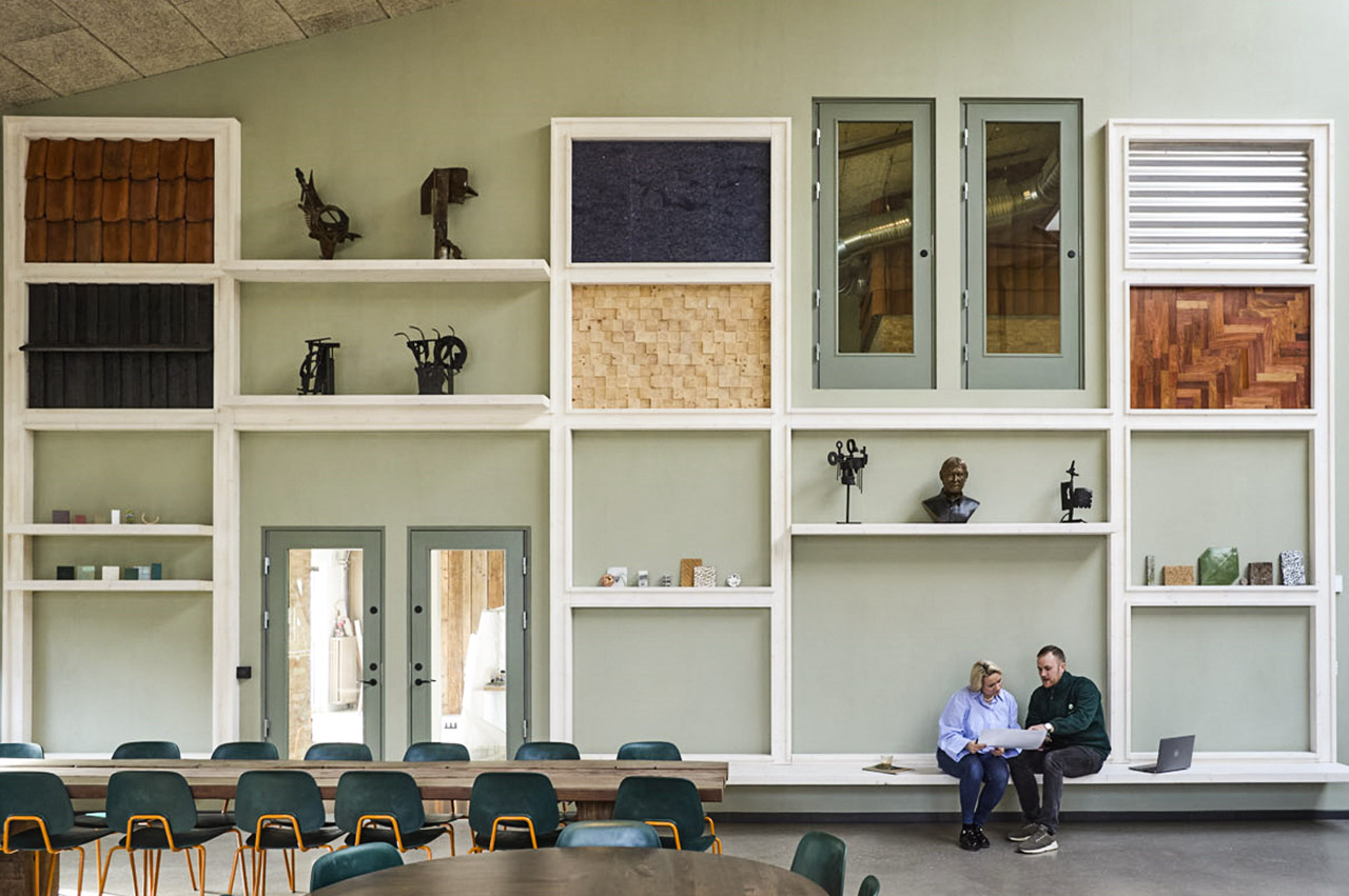 De mange genbrugs- og upcyklede materialer er nøje indtænkt af arkitekten, for at opnå Søren Tschernings ønske om at skabe et hus, der både understøtter trivsel og det udviklende arbejdsmiljø, samt tydeligt viser husets identitet som et ‘genbrugshus’.