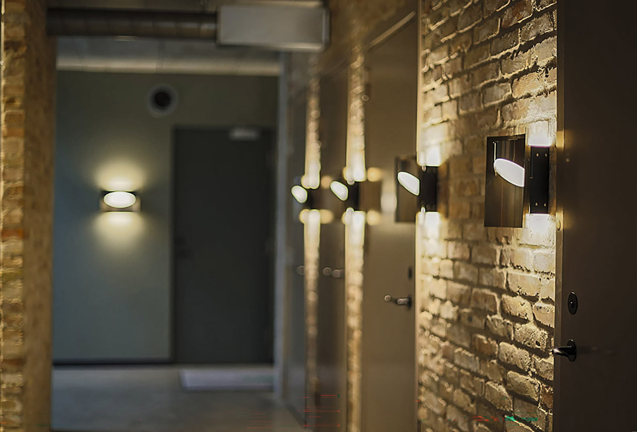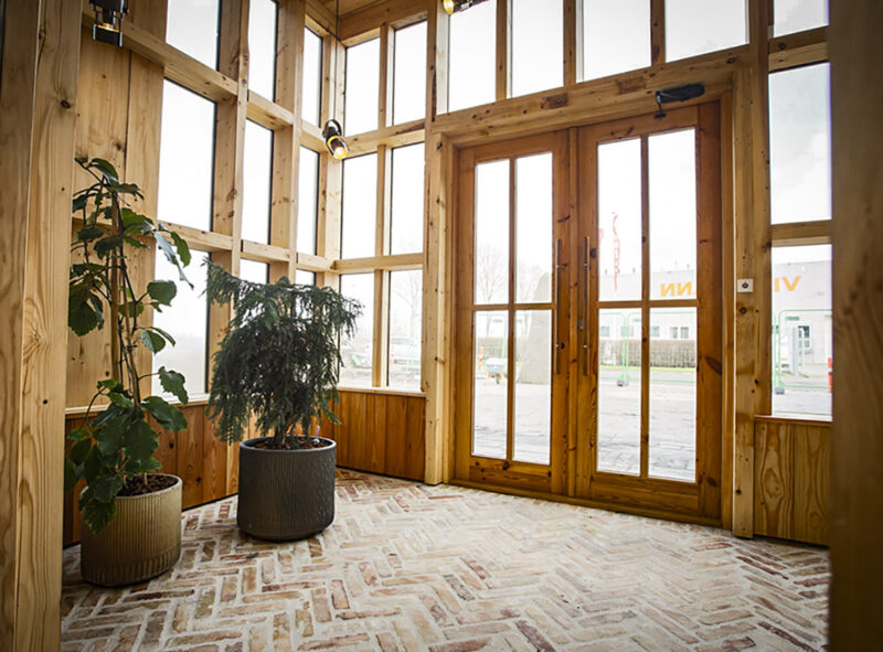 Indvendige døre stammer fra en renovering af Nauticon-bygningen på Sluseholmen, hvor bygherren muliggjorde at materialer blev udtaget til direkte genbrug.