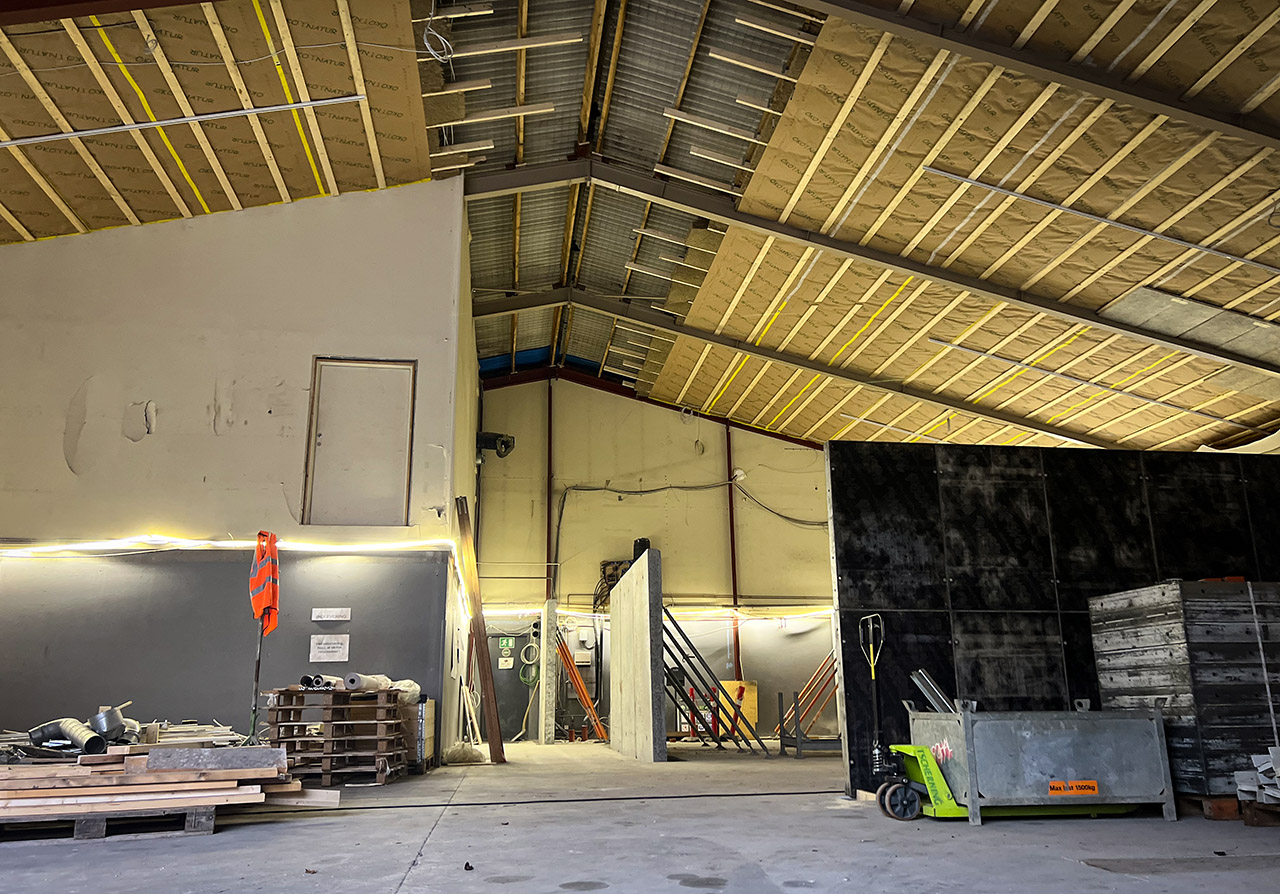 Udstøbte Huldæk - der er placeret på højkant og brugt som bærende vægge, kommer fra nedrivningen af den gamle værdihåndteringscentral i Brøndby Kommune.