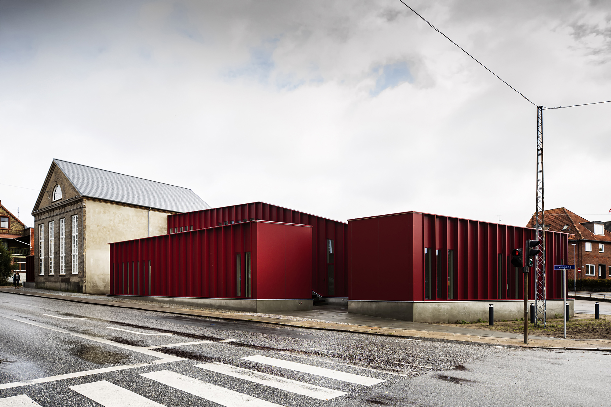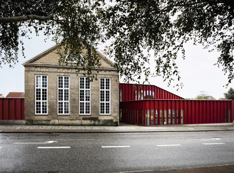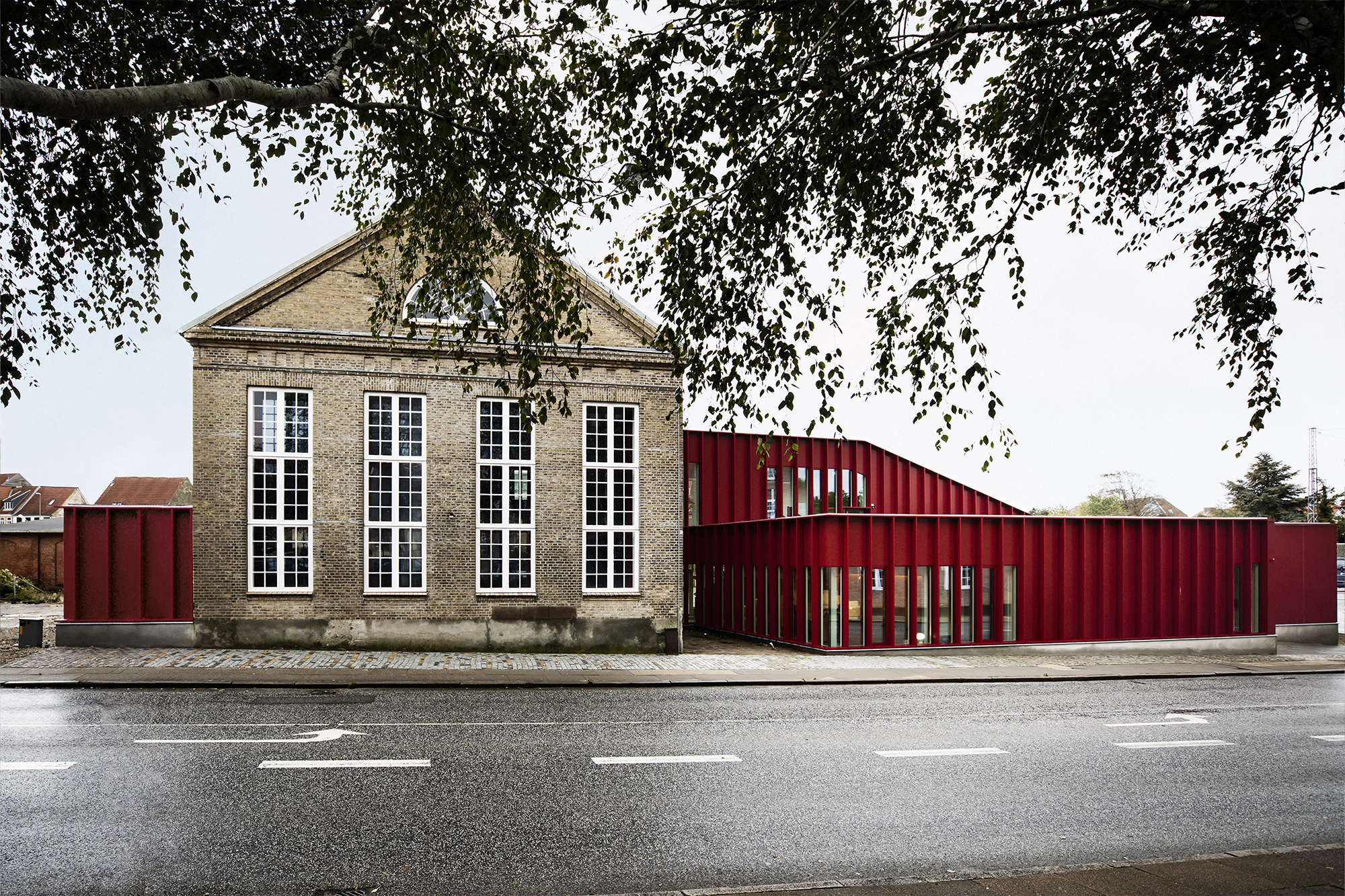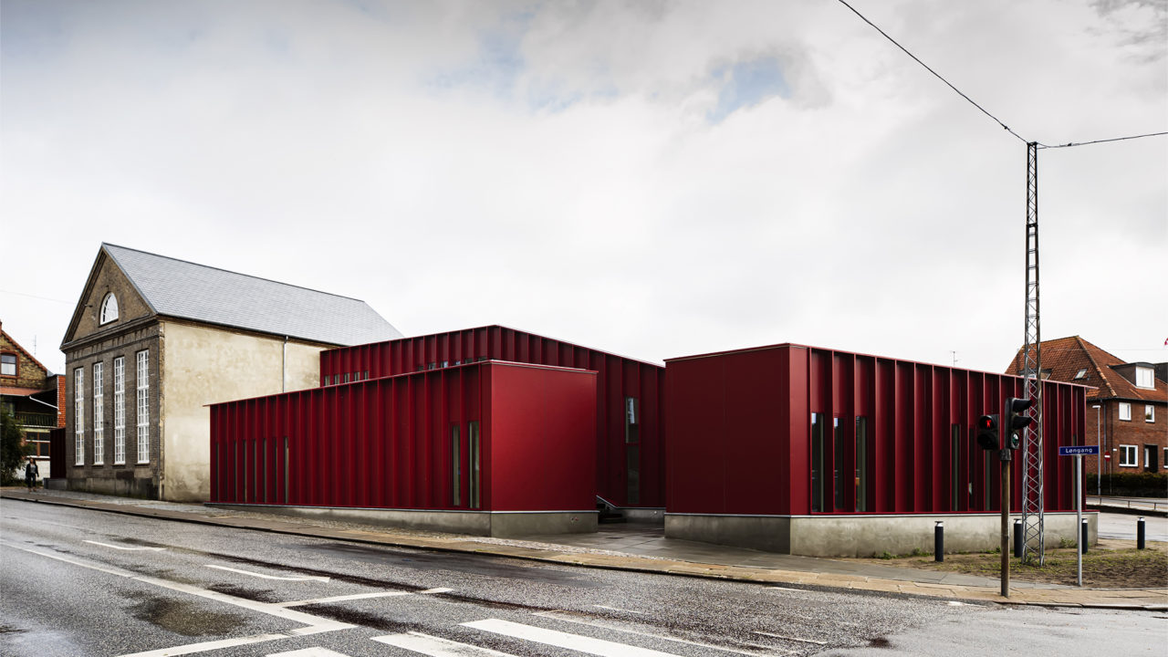 Som modspil til den eksisterende bygnings murstensfacade, består tilbygningen af lette facader med udvendig beklædning – plane røde aluminiumsplader brudt af lodretstående aluminiums lameller. Lamellerne er udført i samme materiale som den resterende beklædning, og fungerer som solafskærmning ved glaspartierne. Lamellerne giver ligeledes en dybde, rytme og energi til bygningen der reflekterer dens funktion og brugerne.