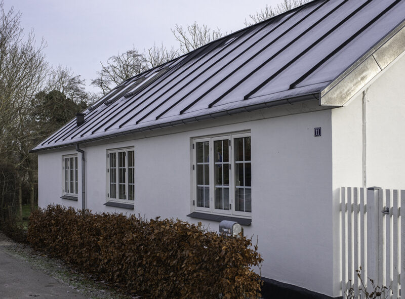 Den ydre beklædning af tilbygningen mod havesiden er udført i 3″ profiltræ som thermoask – et varmebehandlet facadeprodukt som har en ekstra lang varighedsgarati (60-80 år) – uden behandling – det gråner naturligt og bliver til sidst helt sølvgråt.