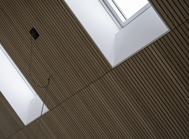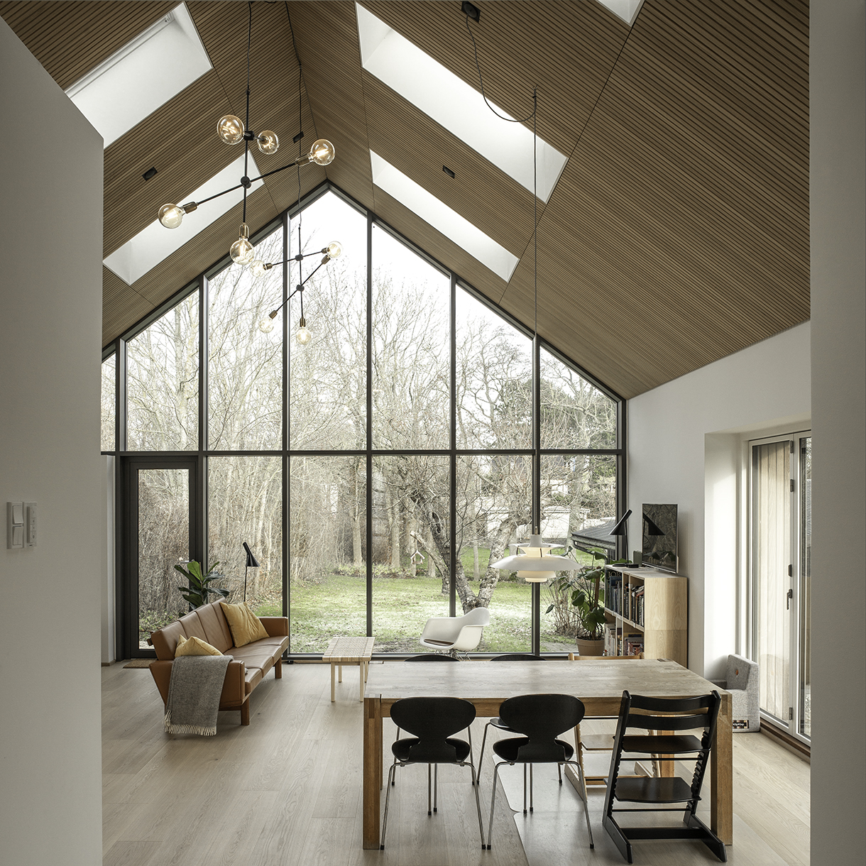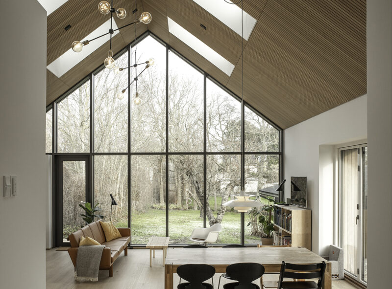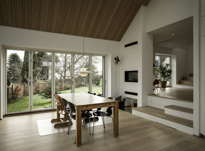En større entre ved indgangen mod syd leder direkte ind gennem boligen og den nye tilbygning som man fra første færd kan se hele vejen igennem boligen. Den nye stue står som eet stort dobbelthøjt rum med egetræsakustiklofter fra Moelven og en stor glasfacade, der vender mod nord og den store have mod Skæring Bæk.