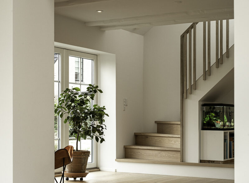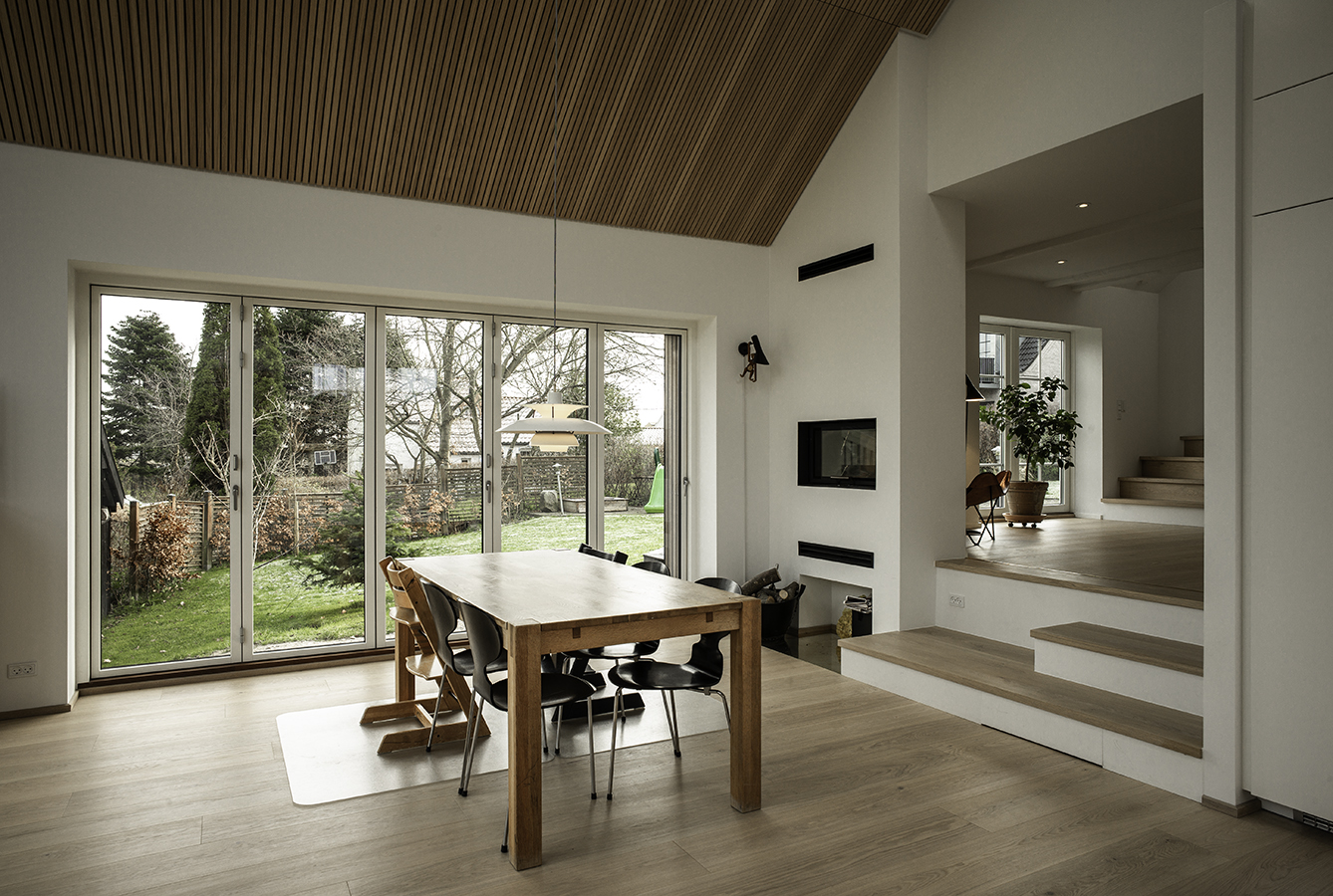 Mellem stue og trapperummet opdeler en ny pejs rummet i to med kig igennem og hyggekrog mod havesiden. Den nye trappe, er indpasset som et møbel i rummet og det nederste trin skaber et lille læsehjørne/ plads til akvariet:-) hvor under der er indpasset en lem til husets ene af to robotstøvsugere. Trappen er, som huset nye listelofter, udført i massive egetræstrin med balustre der følger facadens lodrette linjer og udført med notede samlinger - meget flotte detaljer.