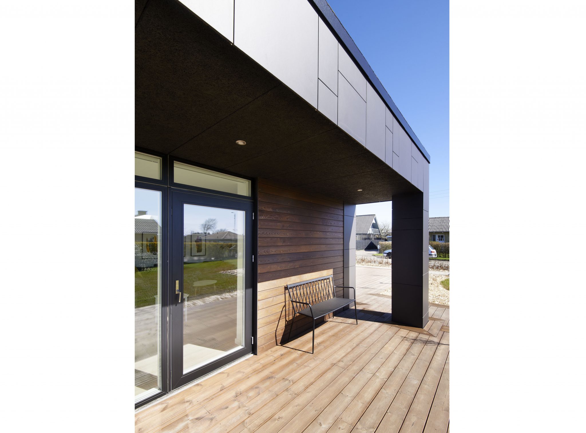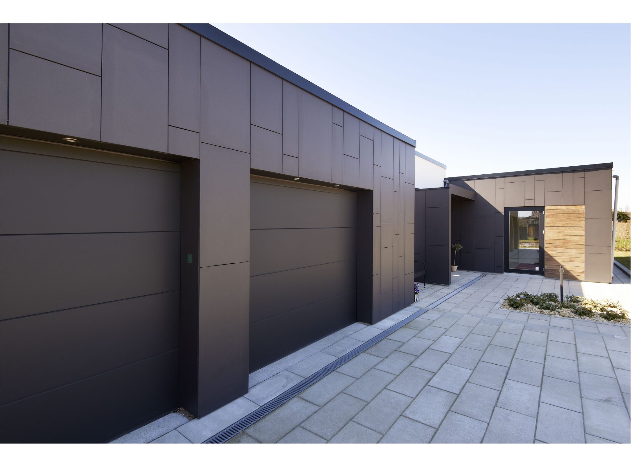 Den eksisterende villa er efter totalrenoveringen og tilbygning arkitektonisk markeret som en hvid kube, hvorpå tilbygningerne er tilkoblet, der markeres i form af de antracitgrå facader med træelementer for at give en varme og glød til facadeudstykket. Tilbygningerne, der rummer stue, værelsesfløj og garage er ca. 0,5 m lavere end eksisterende bolig for at markere konceptet med kontrasten mellem eksisterende villa og tilbygninger.