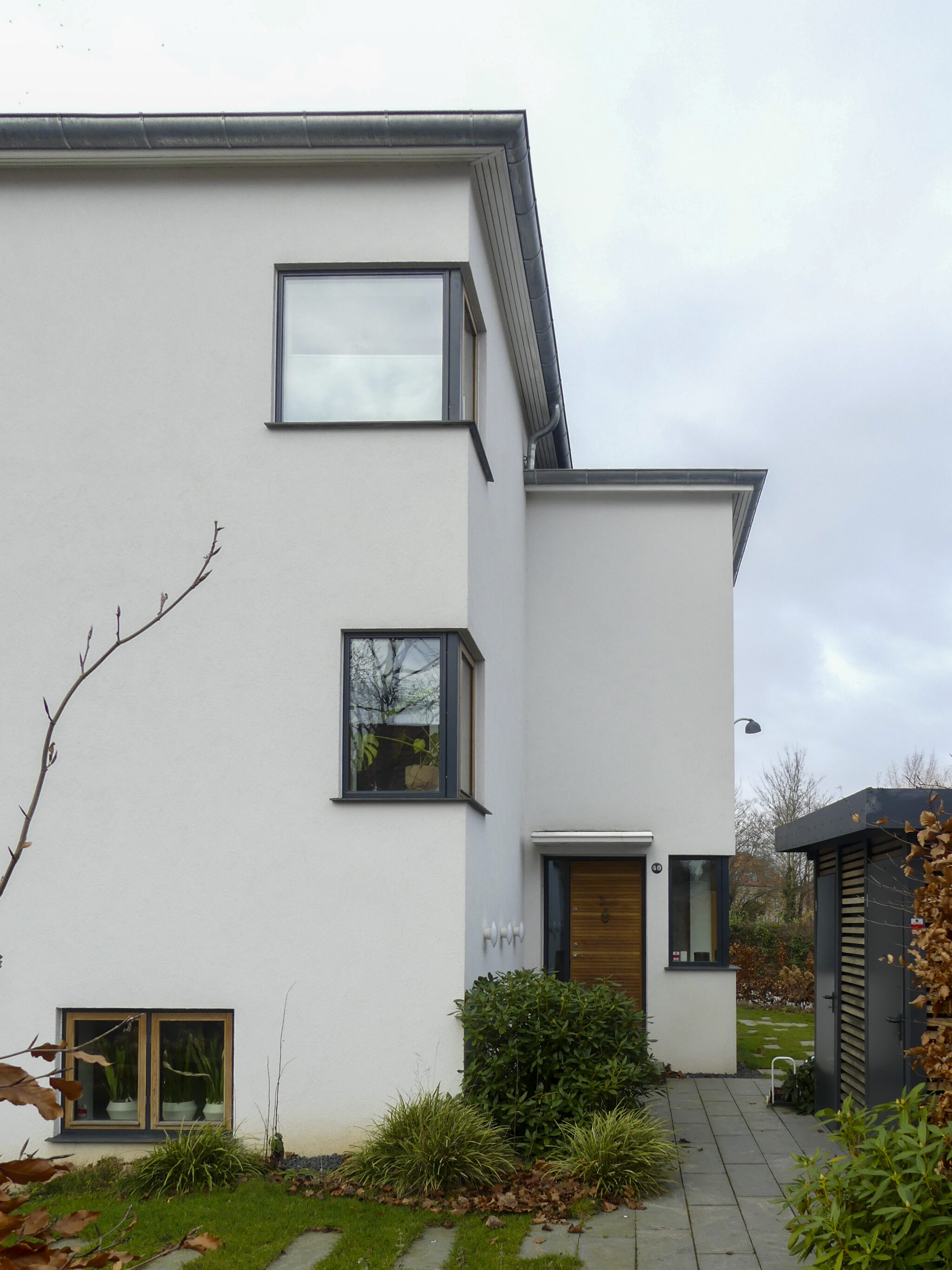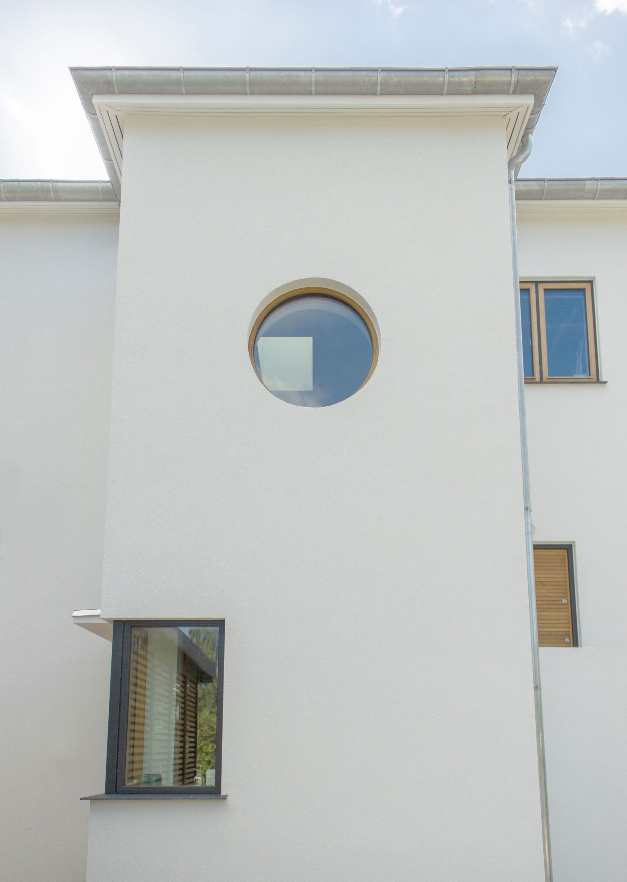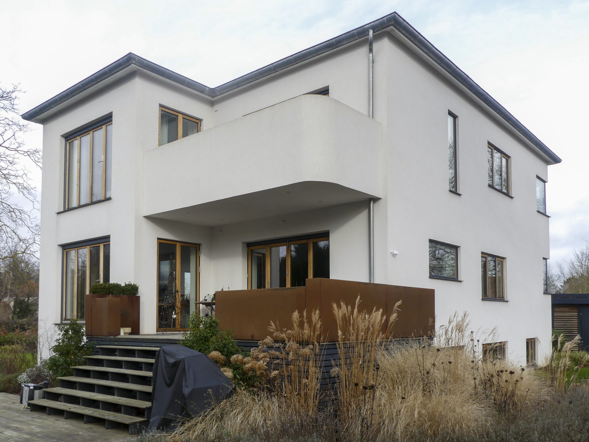 Klassiske funktionalistiske elementer som den lille baldakin over hoveddøren, det runde vindue i trapperummet, vinduer placeret på hjørnet uden hjørnesøjle samt den frithængende altan med buet front er indarbejdet som karakteristiske elementer der skal give huset karakter. Ønsket om etablering af den frit svævende altan, ikke støttet af en søjle, var en væsentlig konstruktiv og arkitektonisk udfordring. Alle sagens parter udviste meget stor forståelse for denne ”detalje” og lagde mange kræfter i at gennemføre denne.