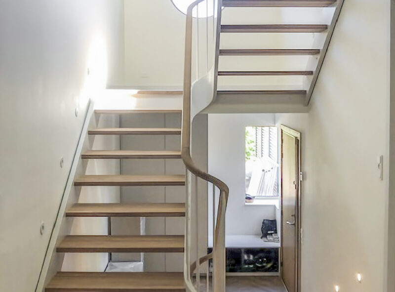 Eksisterende ydervægge og bærende indvendige vægge er bevaret og således været bestemmende for den fremtidige indretning, ligesom eksisterende trappe til kælder har været definerende for husets indretning.
