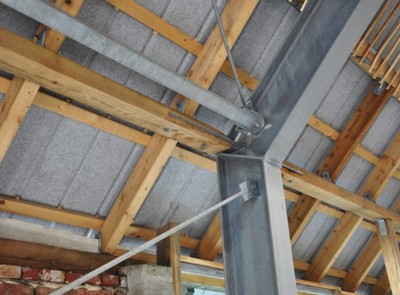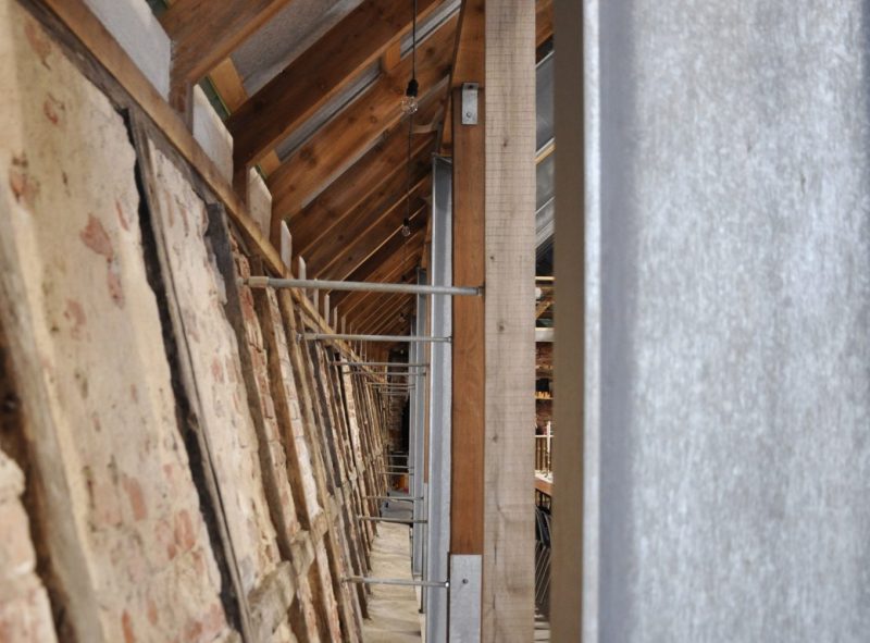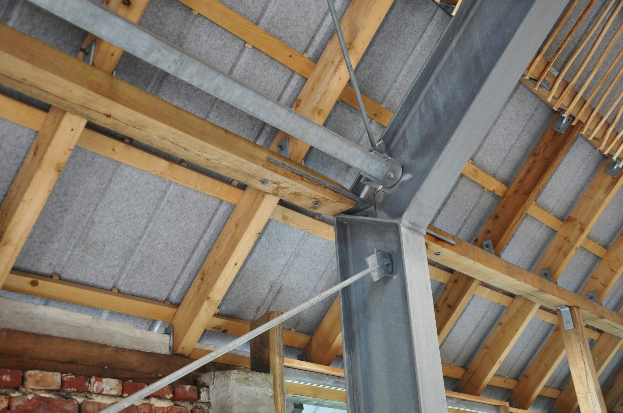 Højremskonstruktionen er væk men dens filigrankarakter er genetableret i en ny form med tagkonstruktionens lag af pandeplader, åse i lærk, stålrammer og pilens naturlige tvist. Materialer, konstruktioner og samlinger er standard men sammensætningen og detaljebearbejdningen gør at de nye lag lever op til ladens håndværksmæssige traditioner.