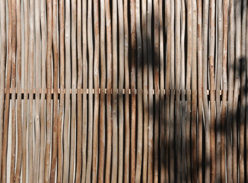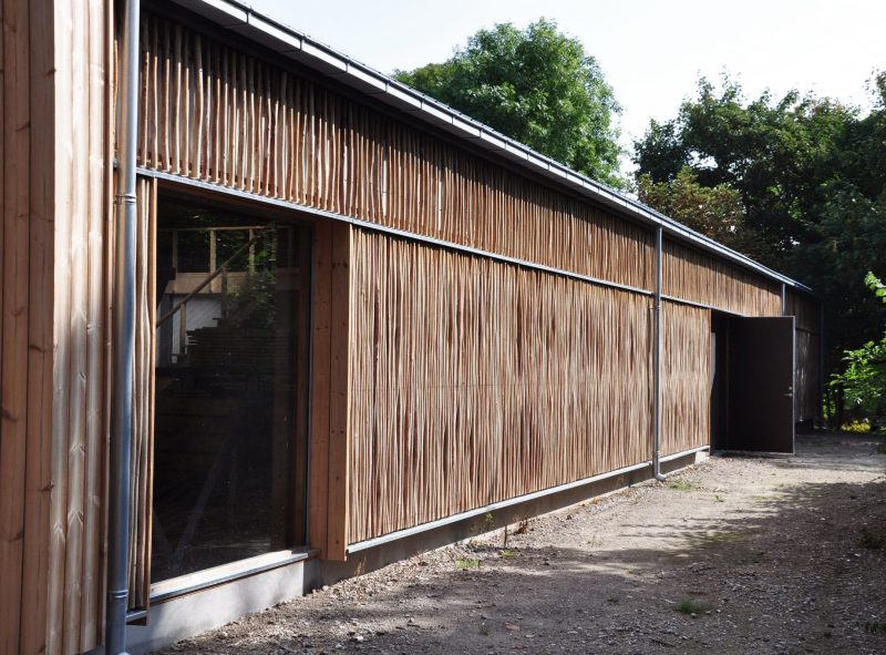 I sidelængerne bearbejdes pilen i virksomhedens specialbyggede maskiner. Pilen varierer i størrelse og karakter – tynde og kraftige, med bark og afbarkede osv. Med inspiration i pilens farver og teksturer, som den vokser på markerne og som PileByg har erfaringer med, har transformationen af de to sidelænger samtidig været opstarten på udviklingen af et nyt facadesystem – som en poetisk og bæredygtig ramme om bygningerne. Mod gårdspladsen er de pudsede grå facader komplementeret af pilebeklædning i tremplen alene, mens længerne på ydersiden har fået nye lette facader med pil i hele højden. Beklædningen er naturligt opdelt ved den oprindelige trempel og de gennemgående stramme zinkafslutninger og lysningsbrædder omkring vinduespartierne indrammer den levende pil. Integreret linjebelysning drysser ud bag pilestammerne og punktbelysning markerer diskret indgangsdørene. Pilen danner således nogle karakterfulde enkle facader med naturens tvist, som netop på dette sted knytter bygninger og sted sammen på en helt særlig måde.