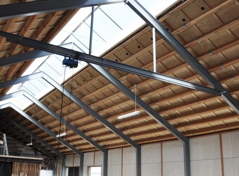 Højremskonstruktionen er væk men dens filigrankarakter er genetableret i en ny form med tagkonstruktionens lag af pandeplader, åse i lærk, stålrammer og pilens naturlige tvist. Samtidig har den nye rammekonstruktion frigjort gulvarealet og med det nye betondæk kan laden i langt højere grad indgå i den daglige produktion og i sammenhæng med de to sidelænger.