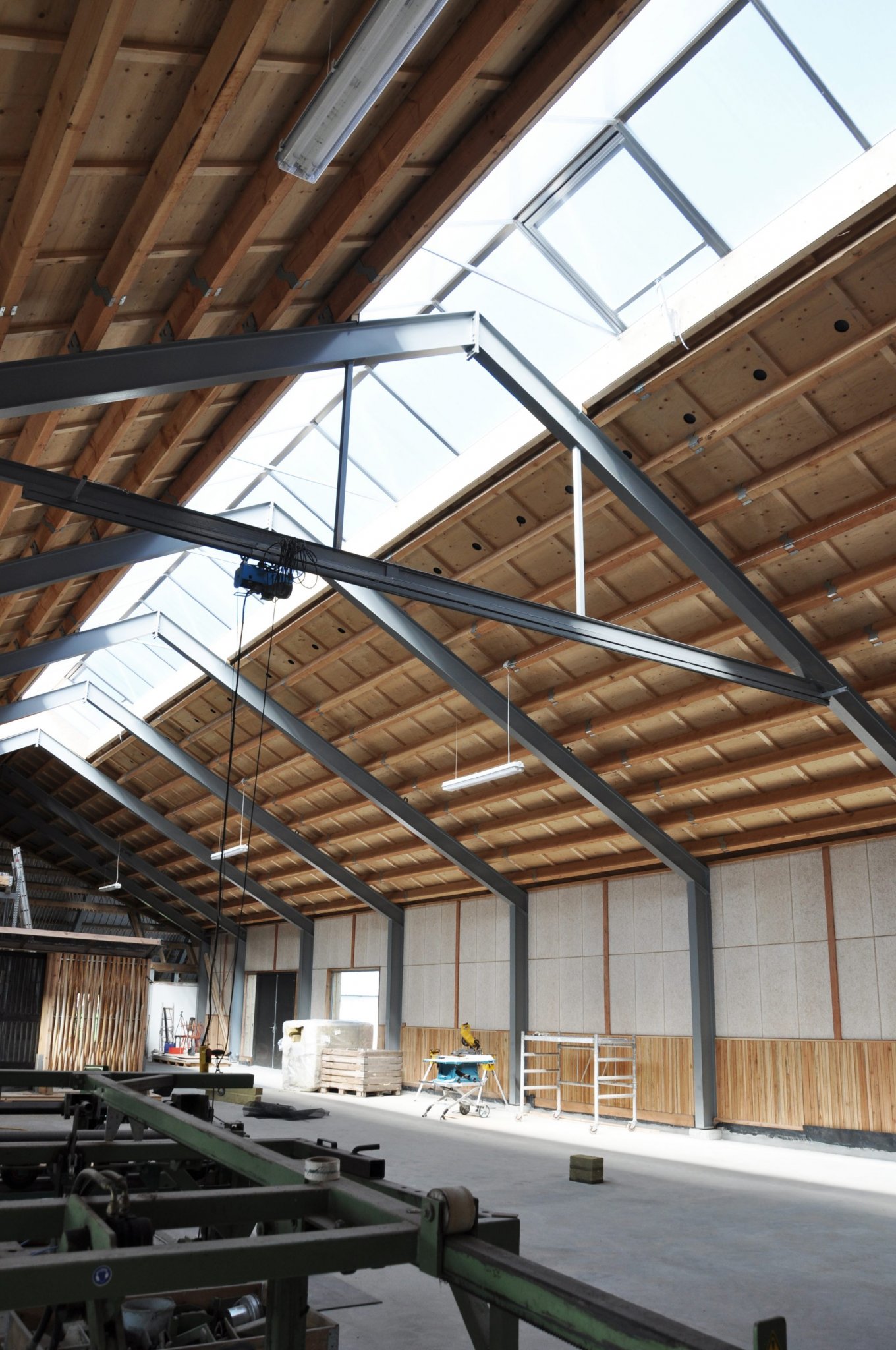 Igen er det den velkendte stålrammekonstruktion med åse i lærk, der bærer taget og fastholder facaderne. Via rytterlysene trækkes dagslys ned i produktionslokalerne og med troldtekt og lærketræspaneler på væggene er der skabt et lyst og venligt arbejdsmiljø.