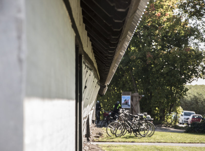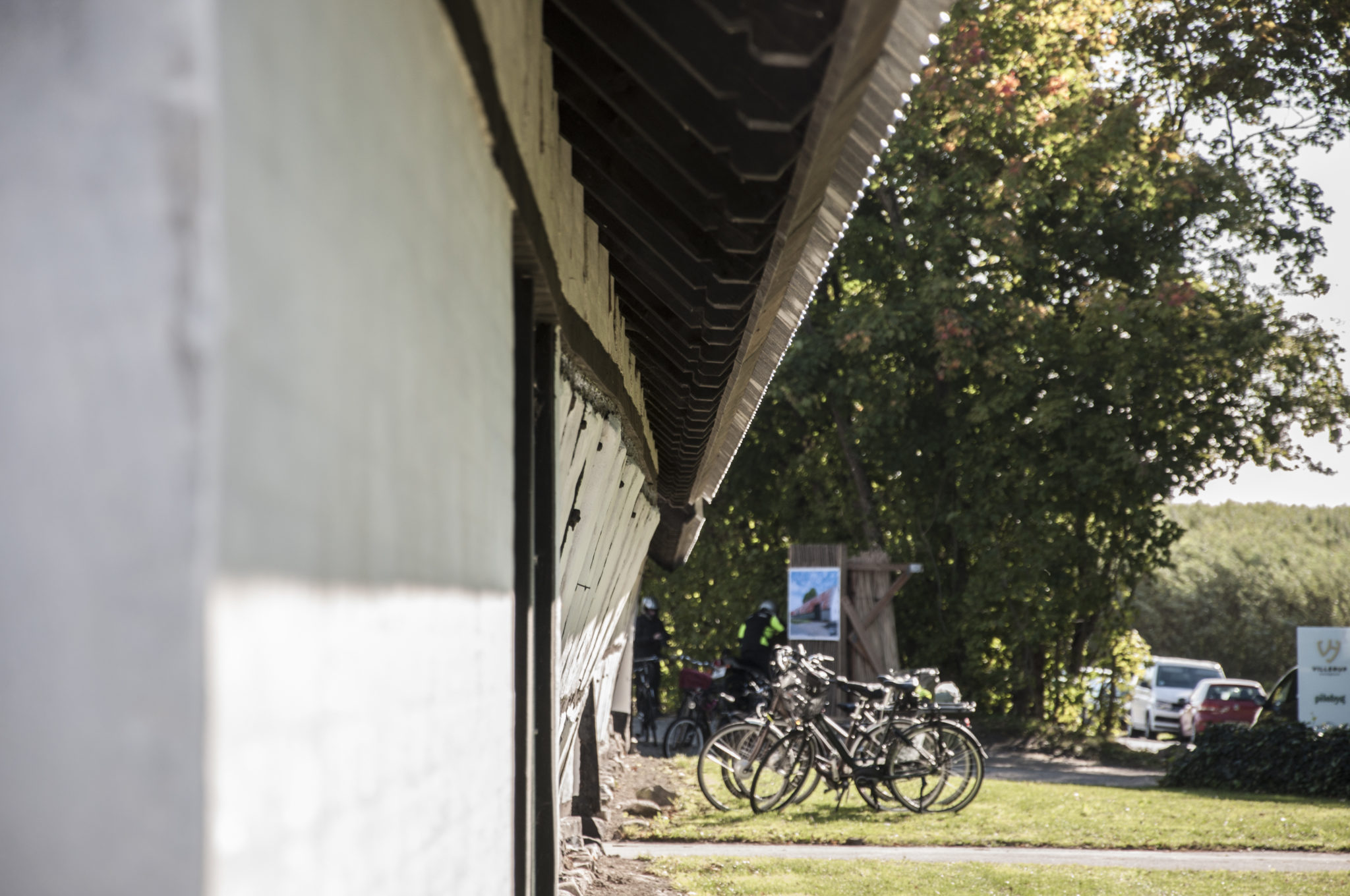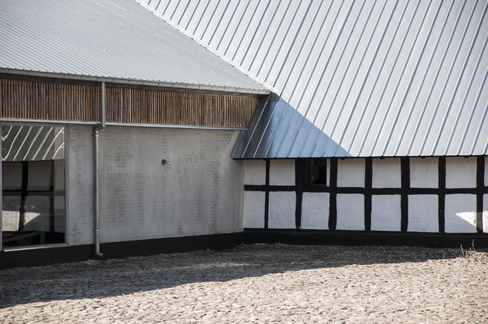 Visuelt er der også skabt større sammenhængskraft mellem gårdspladsens bygninger. Sidelængernes rene linjer med gråtonede facader i pil og puds flankerer og indrammer det skæve og bugtende bindingsværk i midten. Det gennemgående, galvaniserede pandepladetag binder det hele sammen, og understreger med sin underspillede karakter det helstøbte anlæg.