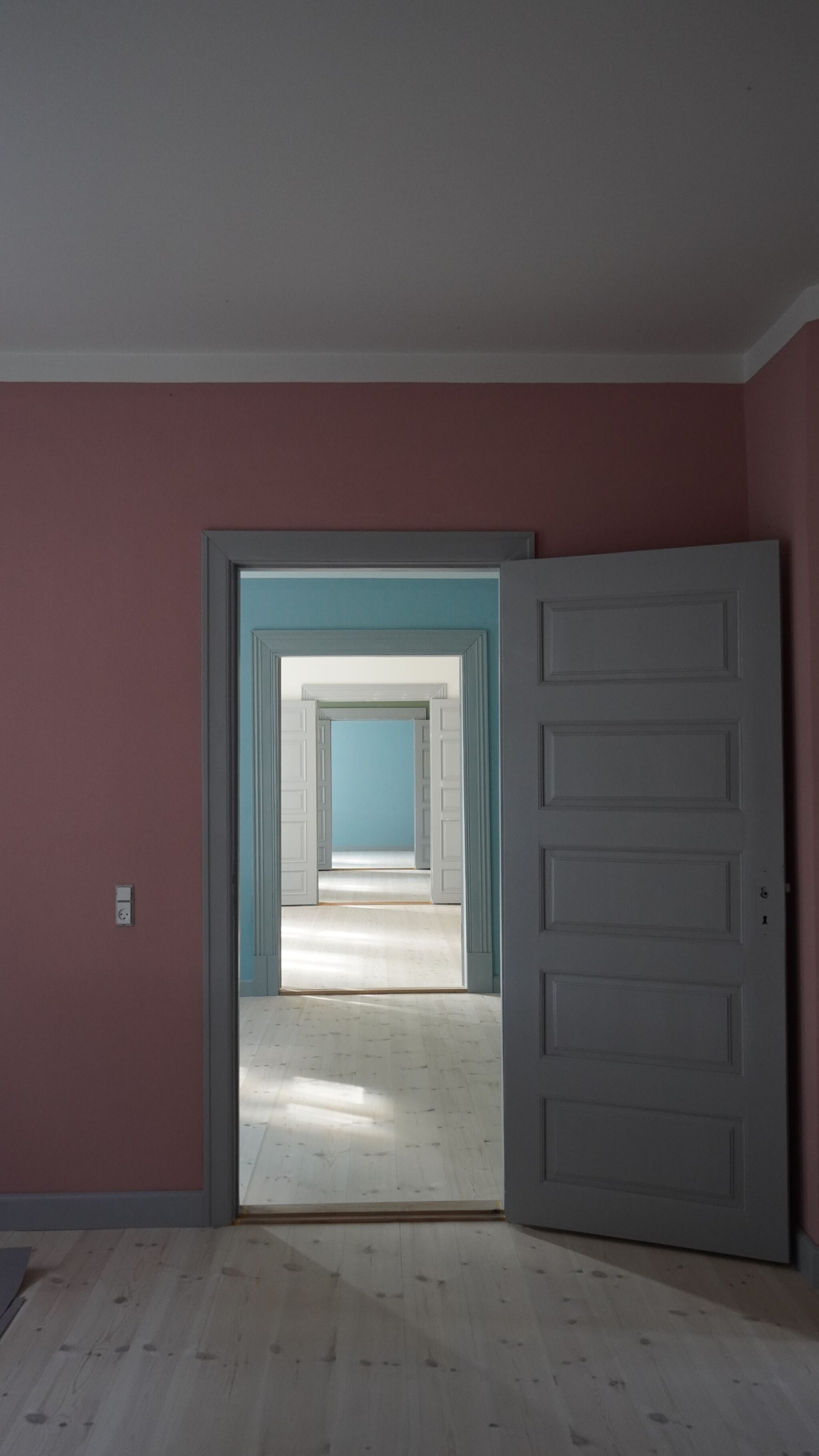 Bygningen bevares opdelt med en langsgående midterskillevæg som skaber flere stuer en suite mod