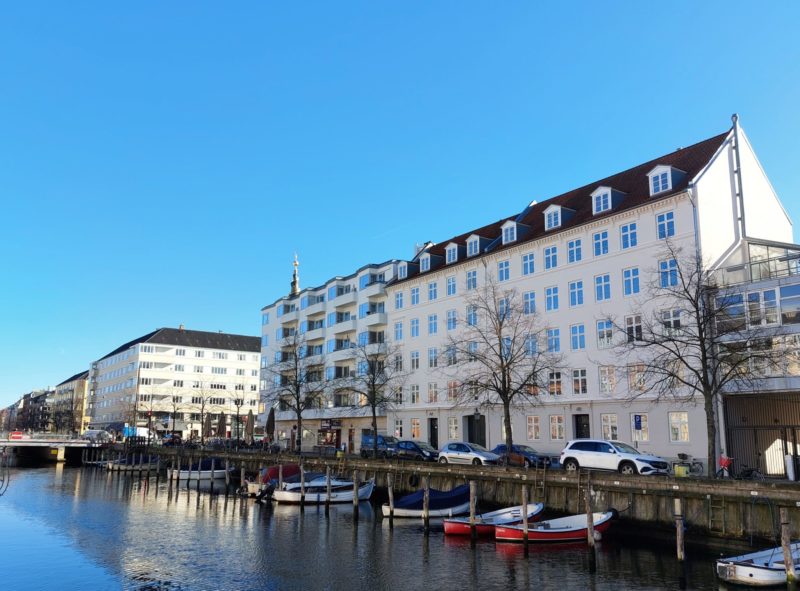 De farverige ejendomme står helt tæt, skulder ved skulder, mellem kanaler og snoede brostensgader her på det gamle Christianshavn, hvor ejendommen, der tilhører Andelsforeningen på Overgaden Oven Vandet 34, ligger.