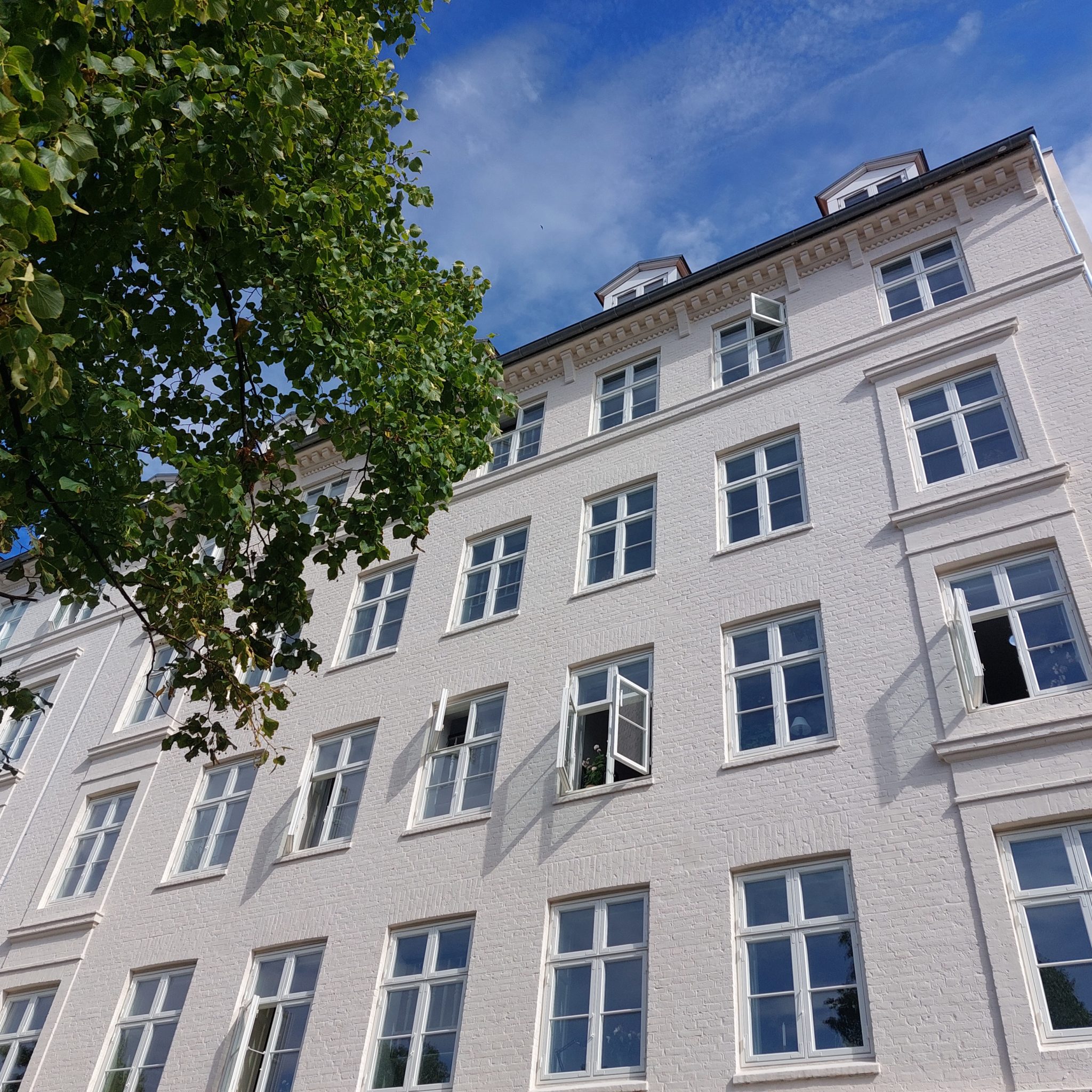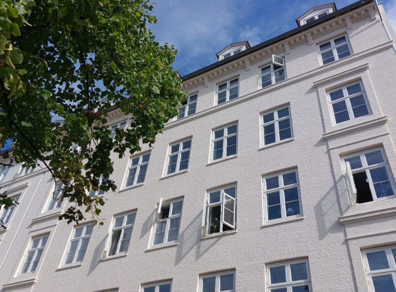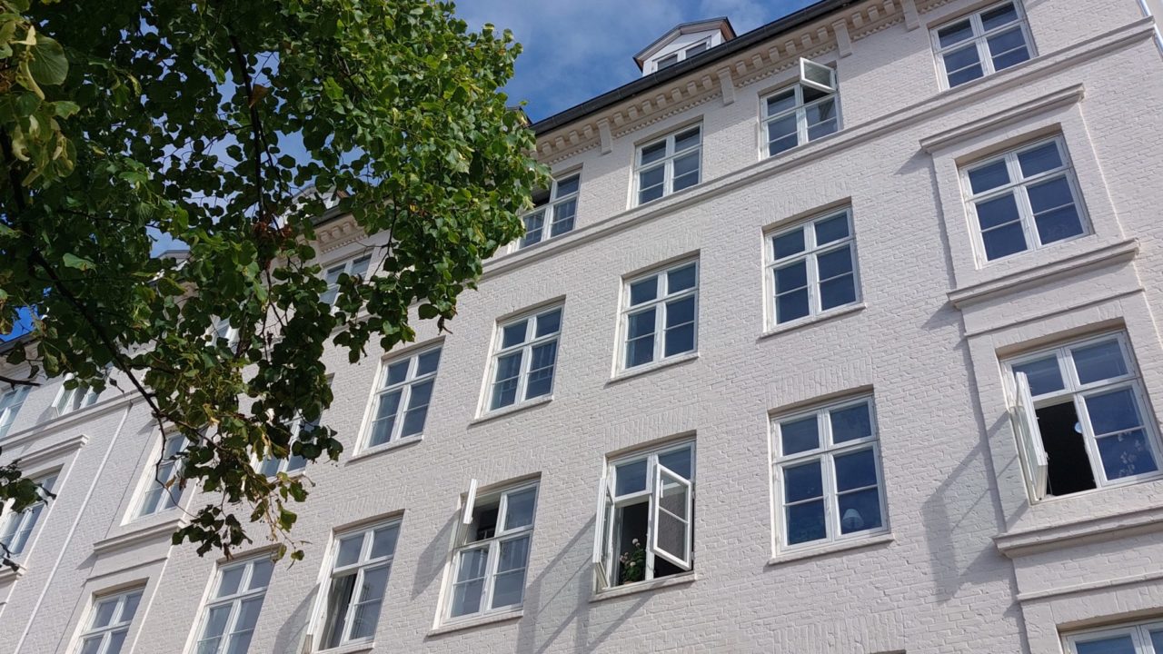 Ejendommen har netop fået et markant ansigtsløft, så den lyser frisk og ”nypudset” op blandt sine lidt mere trætte naboer. Renoveringen af ejendommen omfattede facader og vinduer.