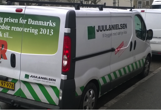 På øverste billede er det entreprenørvirksomheden Juul & Nielsen, som kører rundt i varevogne, der tydeligt viser, at de vandt RENOVER prisen 2013.