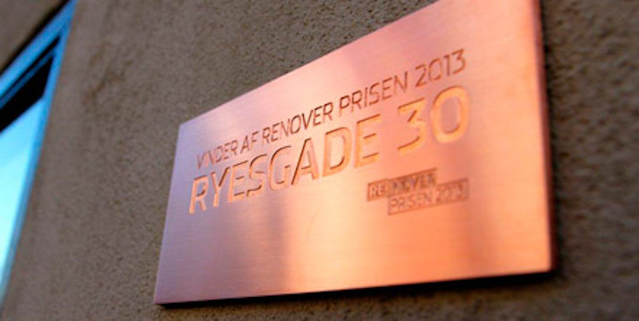Ejendommen Ryesgade 30 fik en kold solskinsdag i november et skinnende bevis på, at den er Danmarks bedste renovering i 2013. En kobber plakette pryder nu den grå facade.
